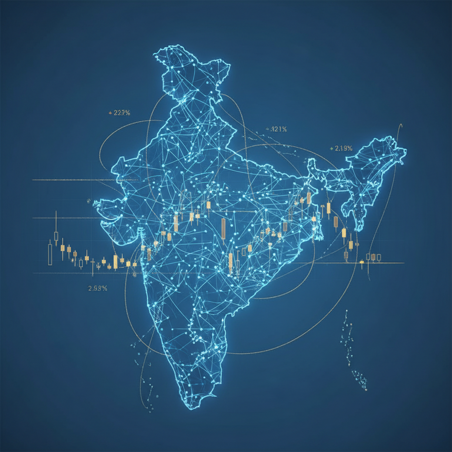{ "prompt": "A sleek, minimalist composition showing a glowing blue AI neural network forming the shape of India's geographical outline, with delicate golden threads resembling stock market charts weaving through it, against a clean white background, cinematic lighting, professional magazine style, sharp focus on the center, subtle depth of field" }